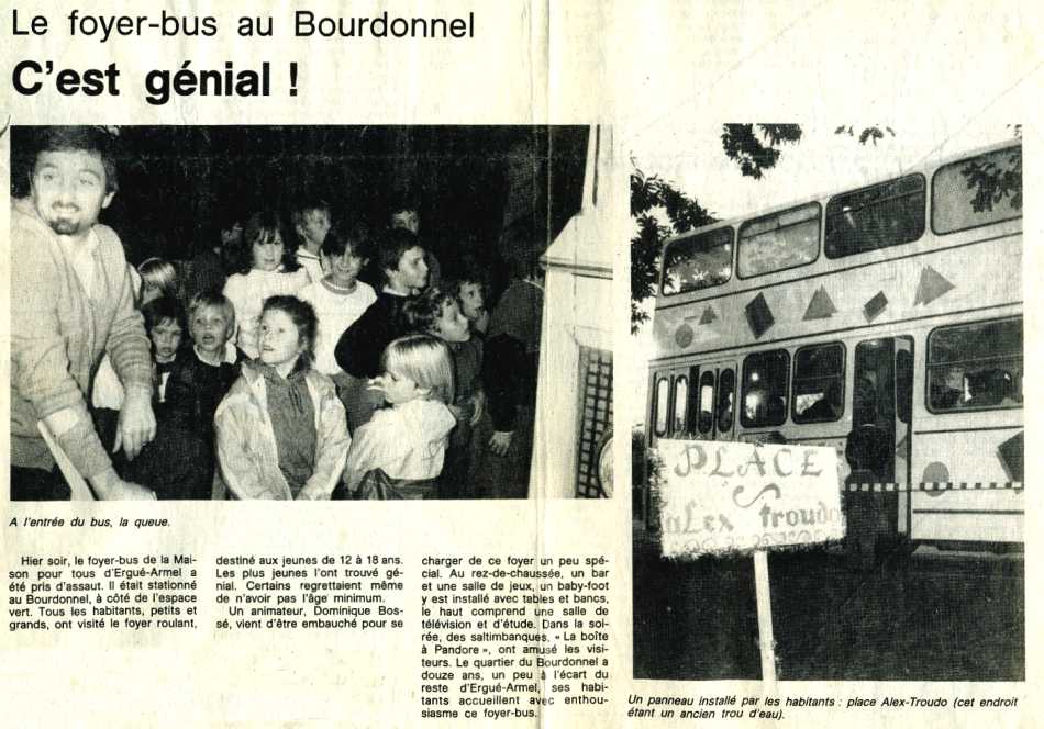 Jeudi 10 avril 1986 : Assemblée Générale de la jeune association à "La Sapinière". À l'ordre du jour, en vrac : Problèmes avec les doubles-vitrages et les chapeaux de cheminées, le "trou d'eau" de l'espace vert enfin bouché, circulation d'engins dans la rue Saint Tugdual, sortie-pêche, activités (informatique, art floral), ramassage du papier, Père Noël, UQEA, Maison des Associations, rond-point prévu avenue de Keradennec, fête de quartier. 16 octobre 1985 : Le Télégramme titre " Le Bourdonnel à l'heure de l'informatique " . Dans ce domaine aussi, le quartier est précurseur. Cette activité durera au moins quatre ans, comme le montrent les documents regroupés sur cette page :